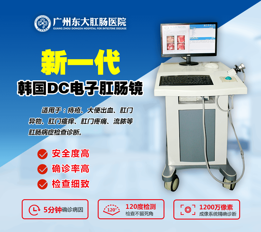 广州东大肛肠医院采用无痛电子肠镜设备,该设备通过安装在肠镜前端的电子摄像探头,将结肠粘膜的图像传输于电子计算机处理中心,显示在监视器的屏幕上,图像清晰、逼真,可直观看到大肠粘膜的各种病变。设备还可以通过肠镜的器械通道送入活检钳取得米粒大小的组织,进行病理切片化验或其它特殊染色,对粘膜病变的性质进行组织学定性,有利于了解病变的轻重,指导制定正确的治疗方案或判断治疗效果。通过肠镜器械的通道还可对结肠的一些疾病或病变如息肉、出血异物等进行内镜下治疗。